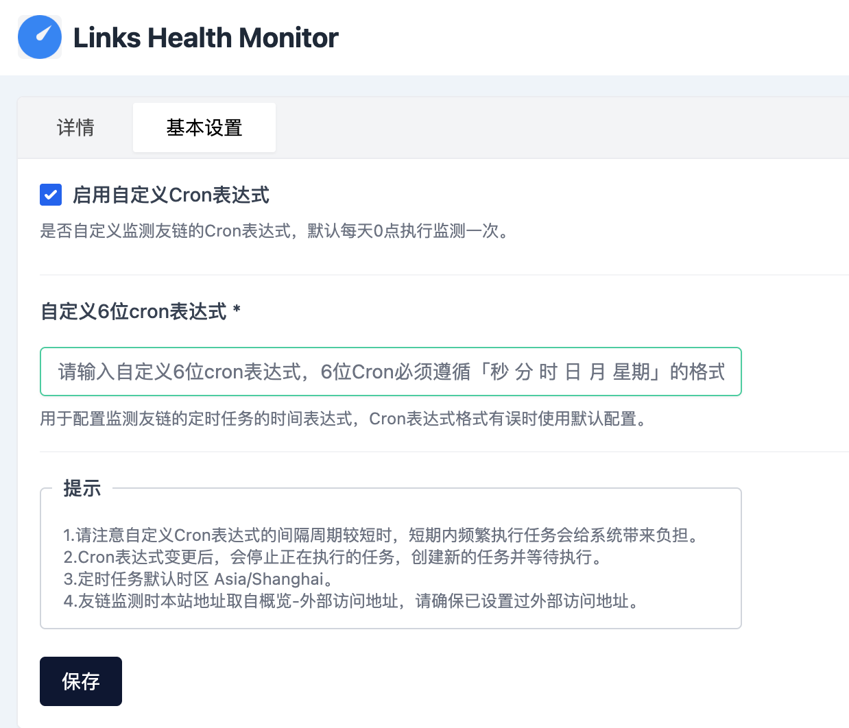 启用友链健康监测:开启后会启用友链健康监测,默认是未开启状态。友链页面地址:网站友链页面的地址,启用友链健康监测后该项必填。
