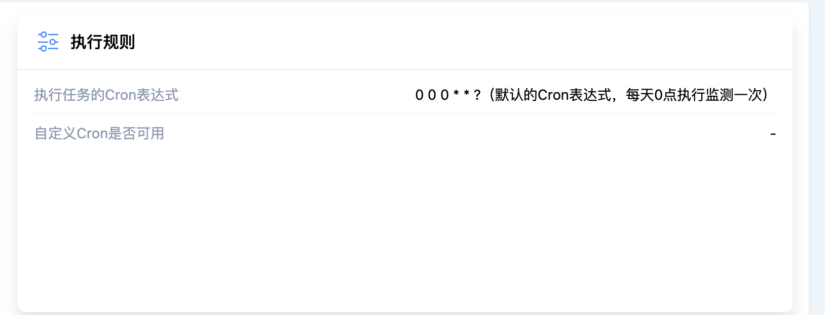 执行任务的Cron表达式:实际执行任务时使用的Cron表达式。自定义Cron是否可用:启用自定义的Cron表达式后进行校验,校验失败则使用默认的Cron表达式。