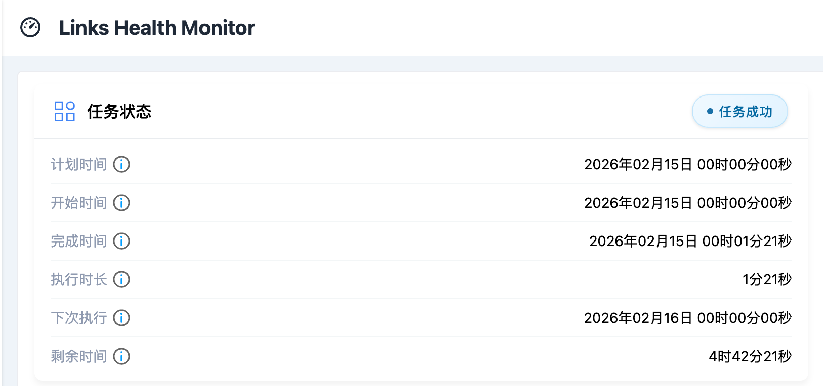 网站名称:友链的网站名称。网站地址:友链的网站地址。网站图标:友链的Logo。所属分组:友链的分组。网站是否可访问:监测时友链网站是否可访问。网站不可访问时后续监测将不再进行。图标是否可访问:监测时友链图标是否可访问。网站最新名称:监测时友链网站的名称。网站名称是否一致:监测时友链网站的名称,与友链的网站名称是否一致。网站页面路由:友链元数据的友链页面地址。对方是否已添加本站为友链:监测时友链网站的友链页面是否含有本站。