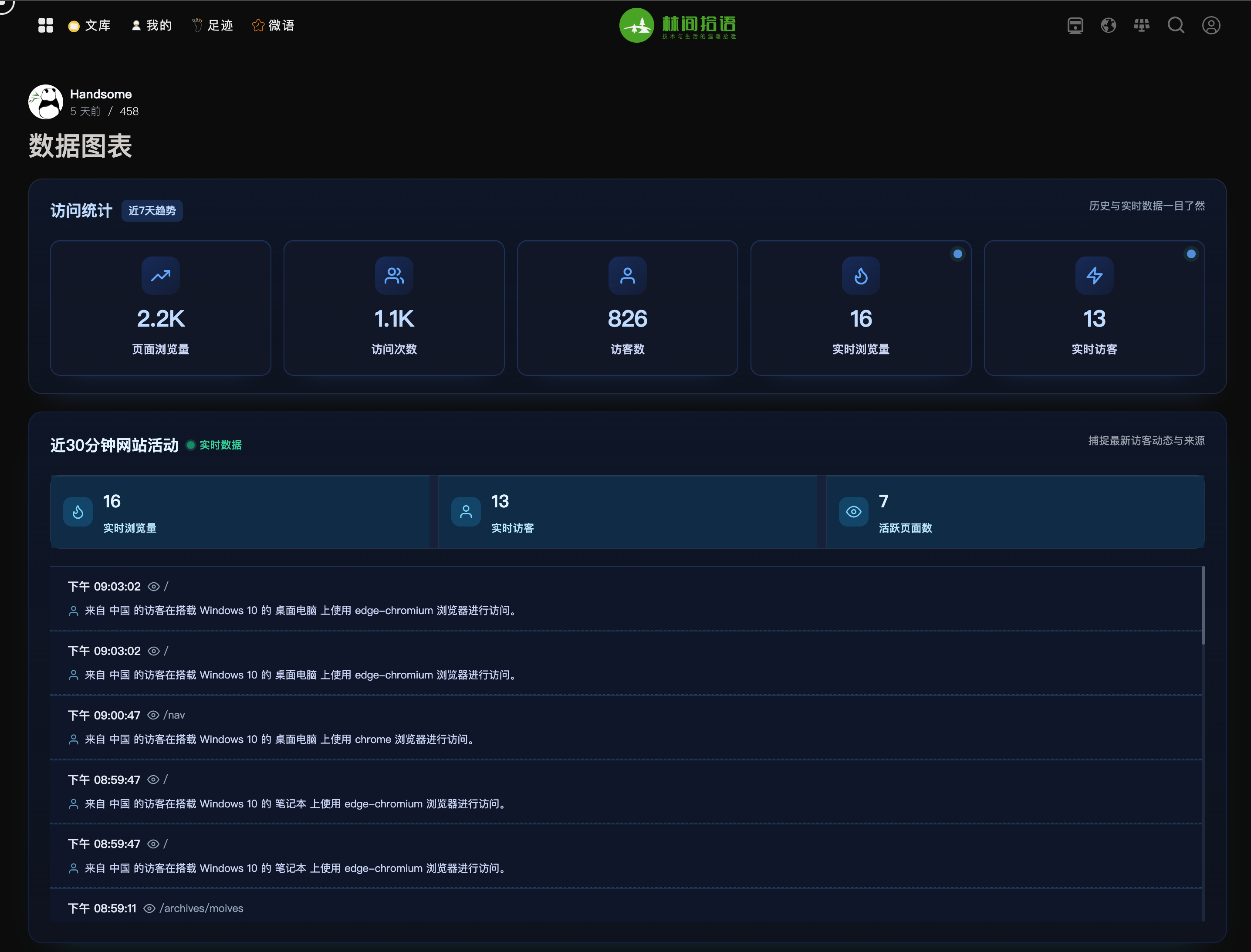 大佬Handsome新做了个数据可视化的插件——数据看板,颜值上还挺好看的,而且比腾讯云EdgeOne和百度统计看着都方便。
