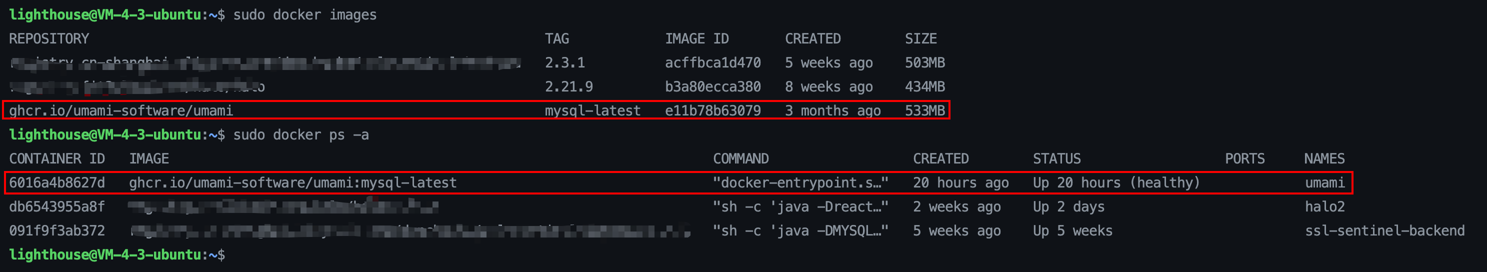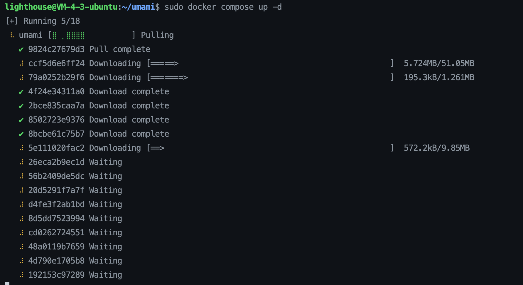 create schema umami collate utf8mb4_general_ci;把docker-compose.yml弄到服务器上,拉取镜像并启动容器,这一过程可能会持续很长时间。