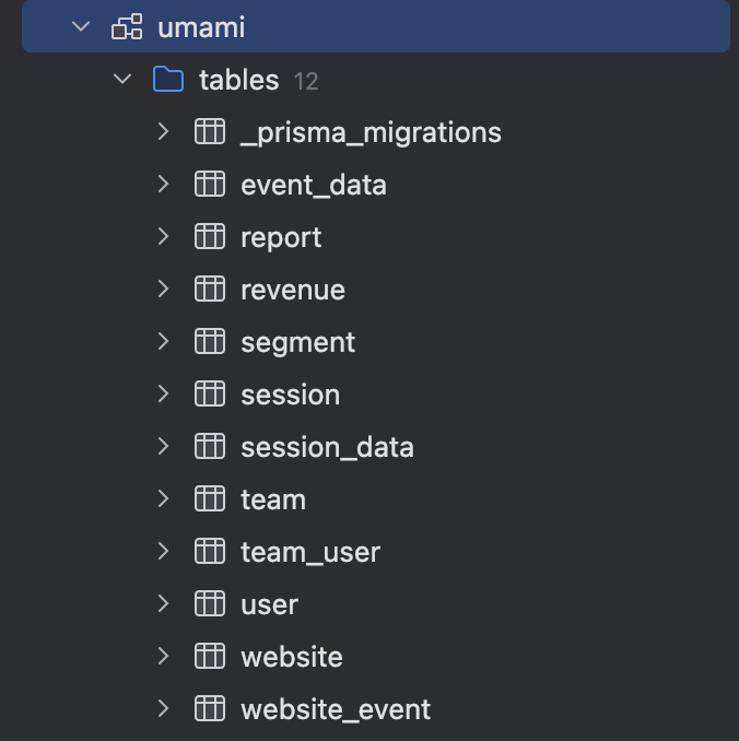 可以看到之前建的数据库umami里已经新建了好多个表。