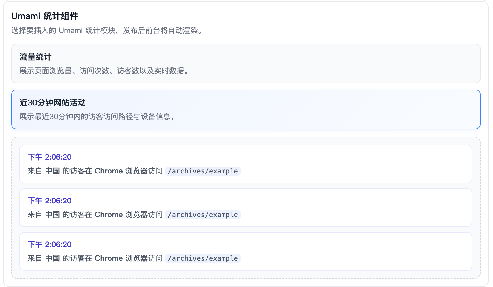 再次添加【umami统计】组件,选择【近30分钟网站活动】模块。