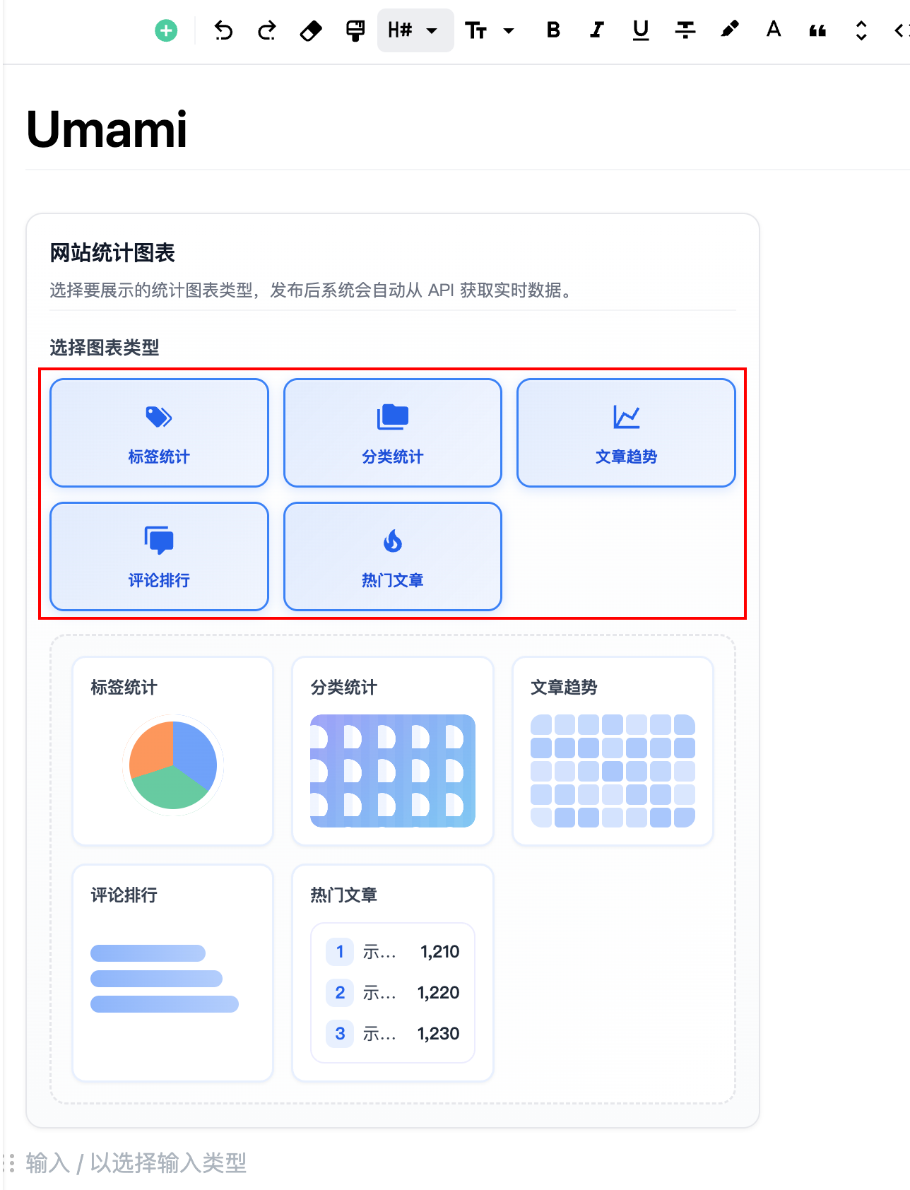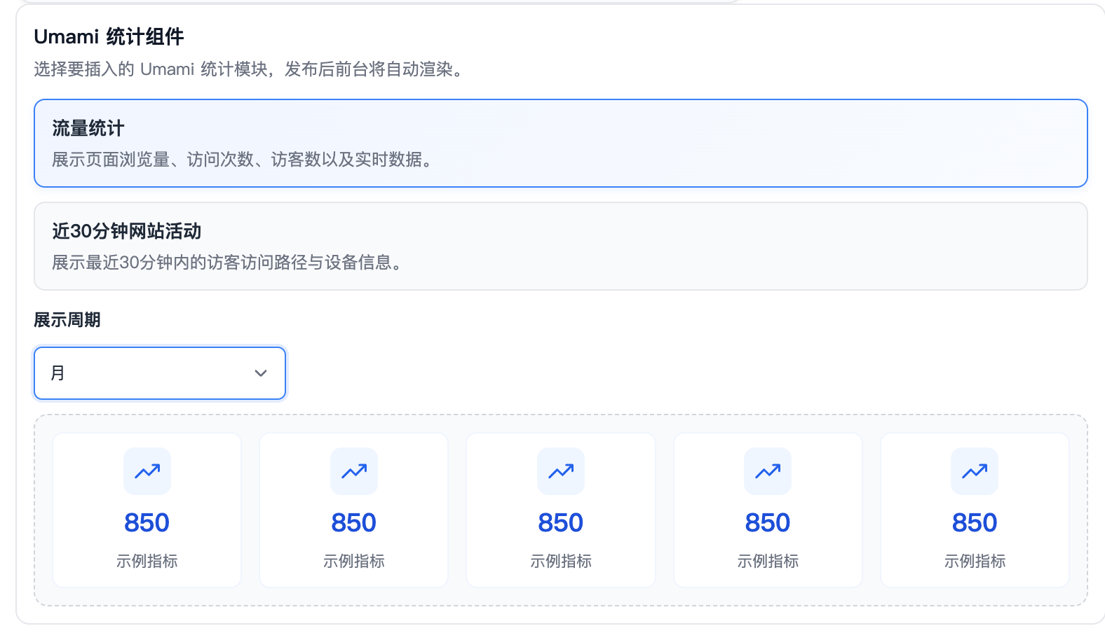 选择【umami统计】组件的【流量统计】模块,展示一个月的数据。